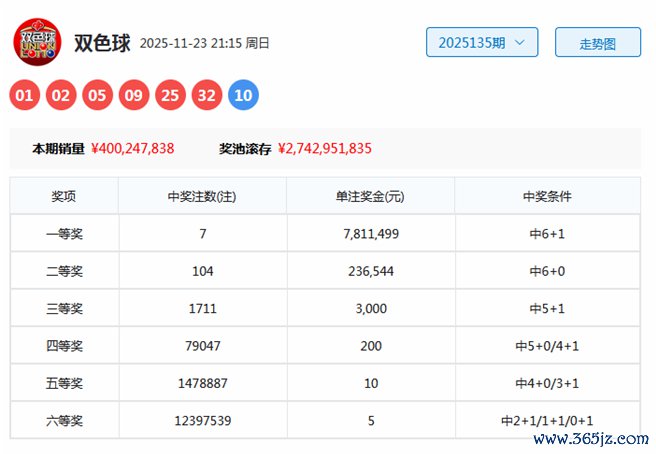 开奖总结:第2025135期双色球奖号为01、02、05、09、25、32+10。区间比:4:0:2,奇偶比:4:2,首尾间距:31。